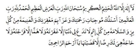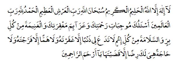 Ля иляхе иллеллахул халимул керим. Субханеллахи раббил аршил азим. Елхамдулилляхи раббил алемин. Ес’елюке муджибати рахметик, ве азаиме мегфиратик, вел ганимете мин кулли бир, весселямете мин кулли исм, ля тедеа ли зенбен илля гафертех, веля хеммен илля ферраджтех, веля хаджетен хийе леке ридан илля кадайтеха. Я ерхамер рахимин.