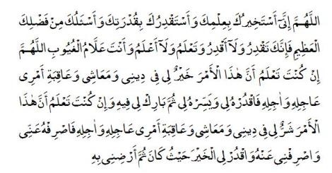 О, Аллах, напъти ме чрез Твоето знание, вдъхни ми сила чрез Твоята сила и ме дари с Твоята огромна благодат! Защото ти имаш сила, а аз нямам, Ти имаш знание, а аз нямам, Ти знаеш скритото. О, Аллах, ако знаеш, че това начинание [тук се назовава нуждата] е добро за мен, за религията ми, за живота и бъдещето ми, отсъди го за мен и го улесни за мен, а след това ме благослови в него. Ако Ти знаеш, че това начинание е лошо за мен, за религията ми, за живота и бъдещето ми, отстрани го от мен и мен отстрани от него, и отсъди за мен доброто, където и да е то, после ме удовлетвори с него.” [ел-Бухари]